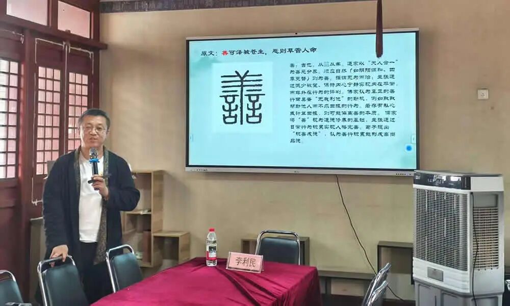 李利民从傅山精神的“性、命、善、恶、验、真、精、用”逐字解析,紧密结合中医文化,一步步说文解字,将这八个字背后的精神解析层层递进,构筑起“正本清源”的完整精神谱系,为同学们打开了全新的视野。随后,李利民带领学生共同朗诵傅山医训,清脆的诵读声在古园之中回响,同学们经历了一场与传统医学精神内核的深刻交流。